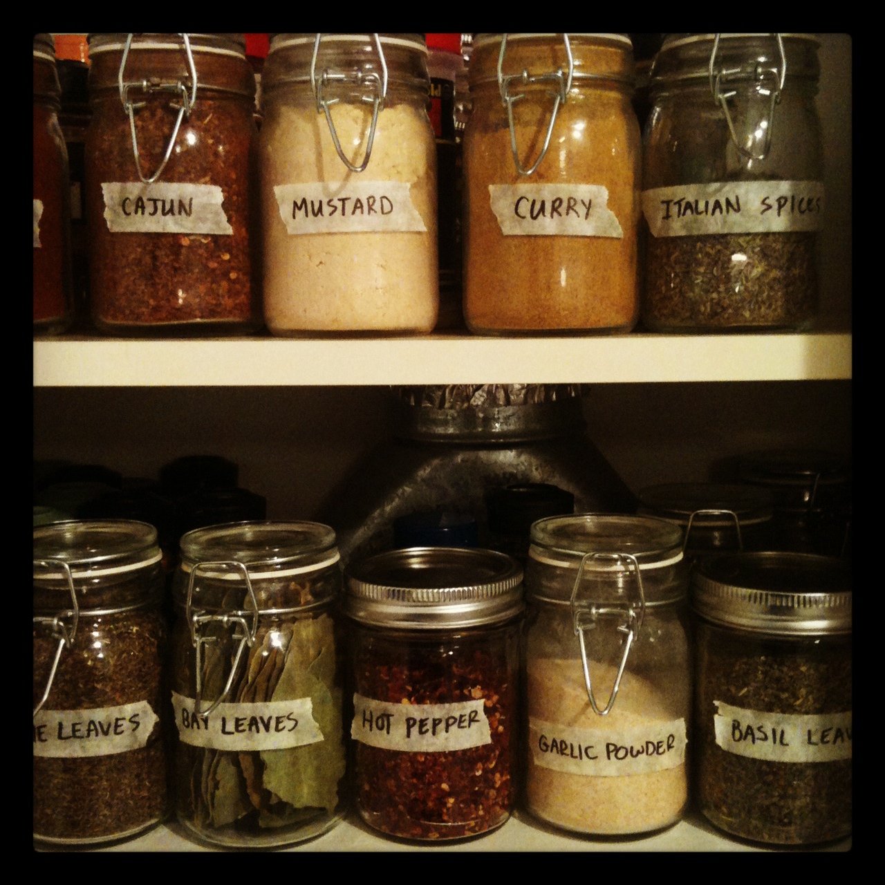 So here is my spice collection. I love having individual containers that look very pretty on a shelf. One of my favorite chef's, Chef Michael Smith, has a dream pantry on his television show Chef at Home. I ogle it every time he pops in for an ingredient. He usually stores his spices in mason jars, which is a much more cost effective way compared to most of the jars pictured in my photo. I did get some of these jars from the dollar store, but now I have a mix of the two. I'll admit, I'm a mason jar fanatic. (Thanks Pinterest!)